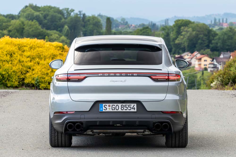 Opadająca ku tyłowi, niżej poprowadzona linia dachu i poszerzona o 18 mm tylna część nadwozia wpływają korzystnie na proporcje i wygląd auta. Całość uzupełniają trzy spojlery, w tym jeden aktywny, wysuwający się nad tylnymi lampami. Dodatkowo Cayenne można zamówić z dachem z włókna węglowego, przetłoczonym jak w modelu 911 GT3 RS.